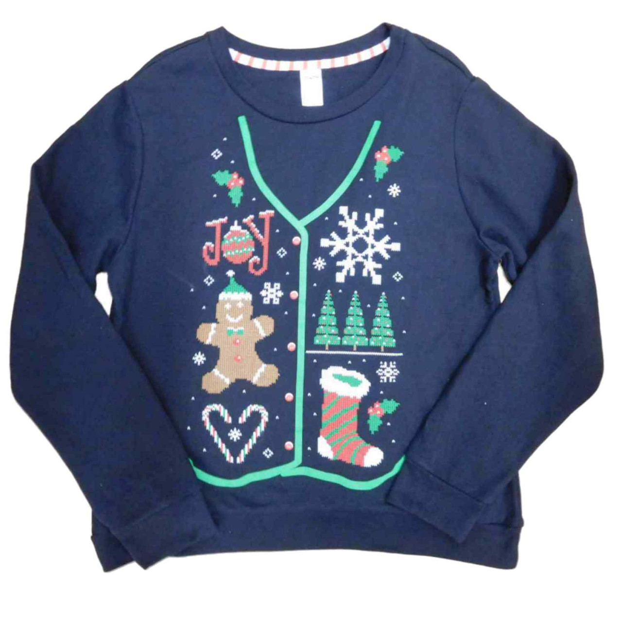 This cozy black long sleeved sweatshirt has "Joy", Gingerbread, snowflakes, candycanes and a faux sweater vest print on the front. It is sure to be a holiday favorite!