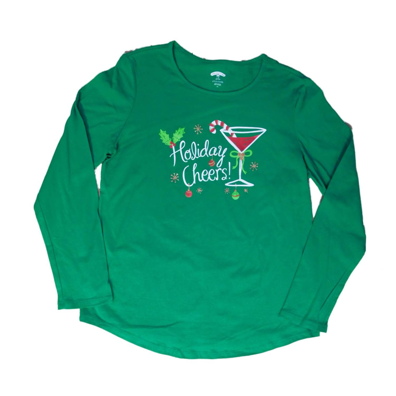 - Holiday Time Womens Plus Green Holiday Cheers Christmas Long Sleeve T-Shirt