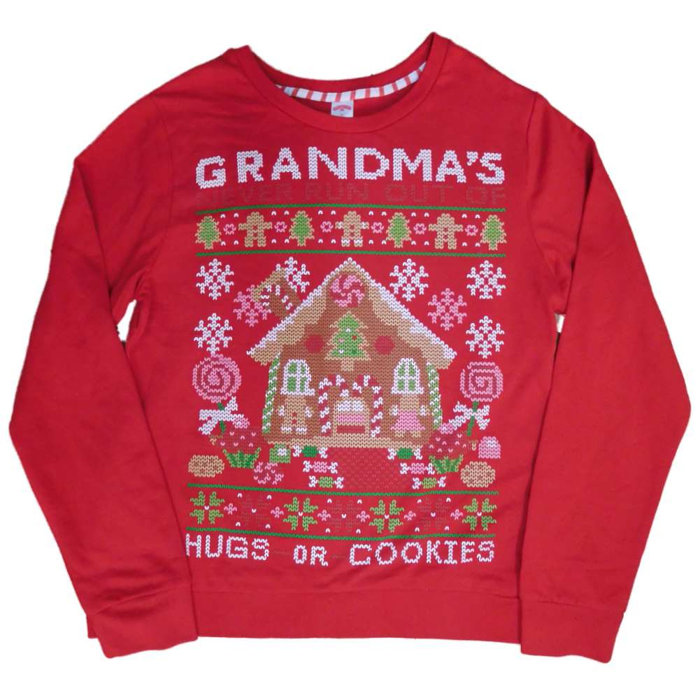 This cozy red long sleeved sweatshirt has a gingerbread house and "Grandma's House Never Runs Out of Hugs or Cookies". It is sure to be a holiday favorite!