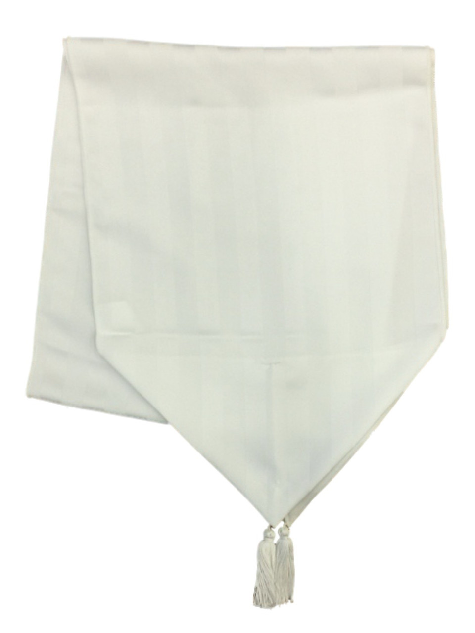 This pretty fabric table runner features a subtle white stripe pattern. It is a great look and will add bit of elegance to any table