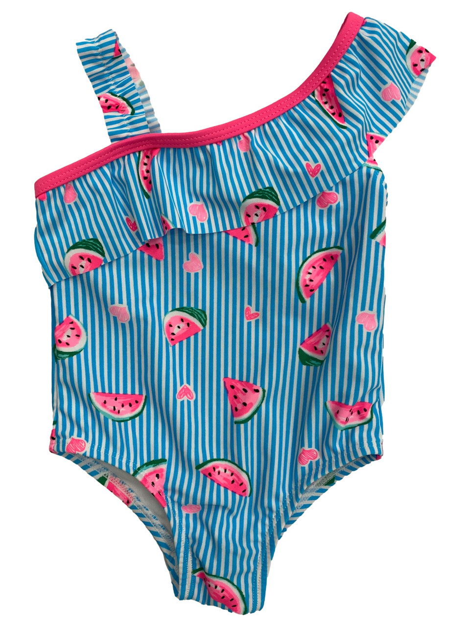 She will be ready for the beach or pool in this pretty ruffled blue and white striped with watermelons one piece baby swimming suit!