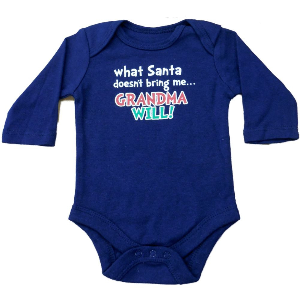 This adorable baby boy's blue bodysuit says "What Santa doesn't bring me... Grandma Will!" and is perfect for holiday or everyday use!