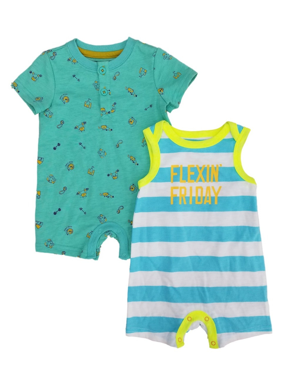 This 2-piece baby romper set includes a sea green short sleeve romper patterned with crabs, barbells and sandcastle designs as well as a sleeveless romper with striped patterns and "Flexin' Friday" print on front. They both have bottom snap closures for ez changing.