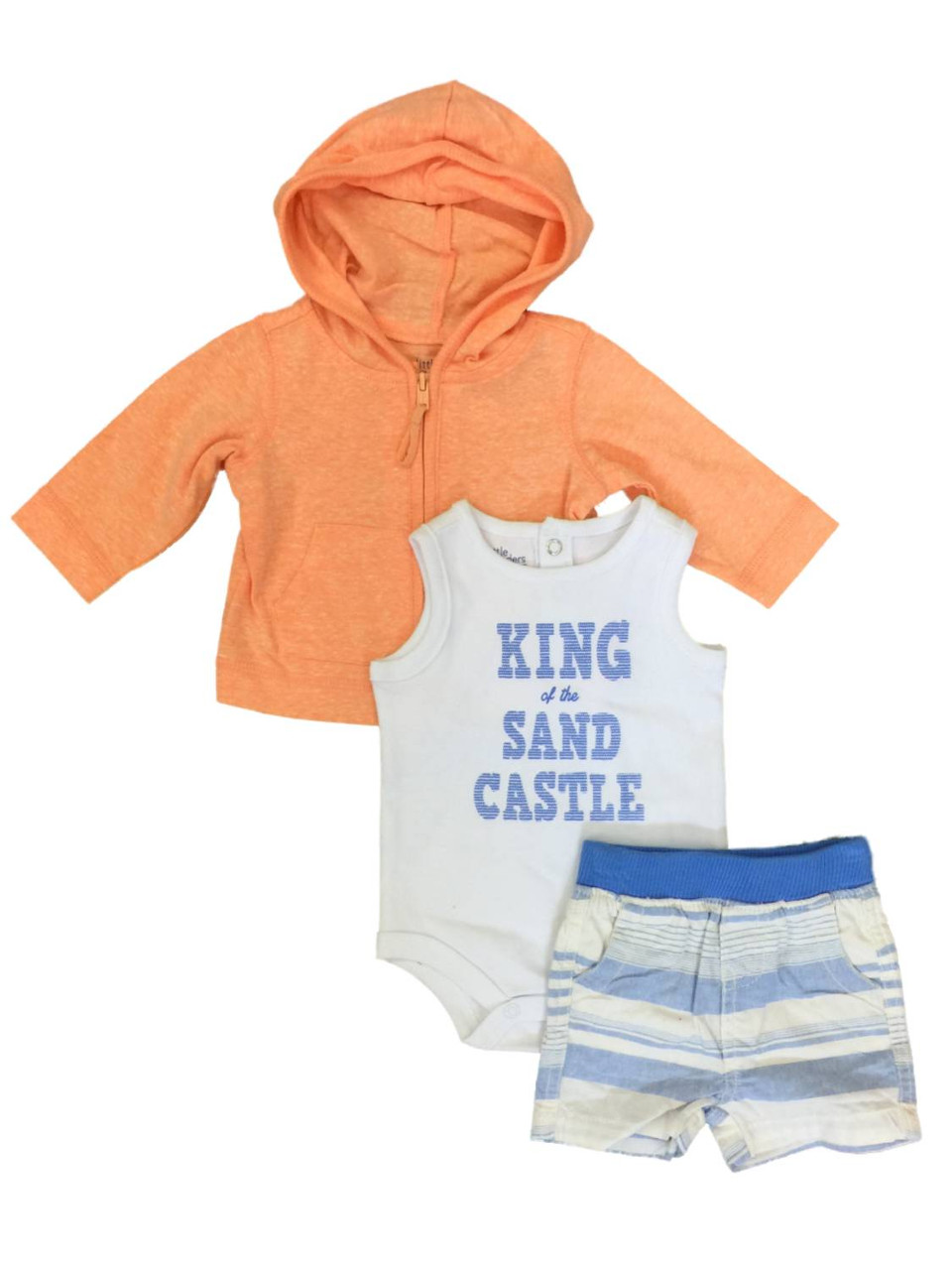 This baby boys 3-piece clothing set includes an orange heather hoodie with zip closure, a white sleeveless bodysuit with "King of the Sand Castle" print and blue/white striped shorts with an elastic waistband.