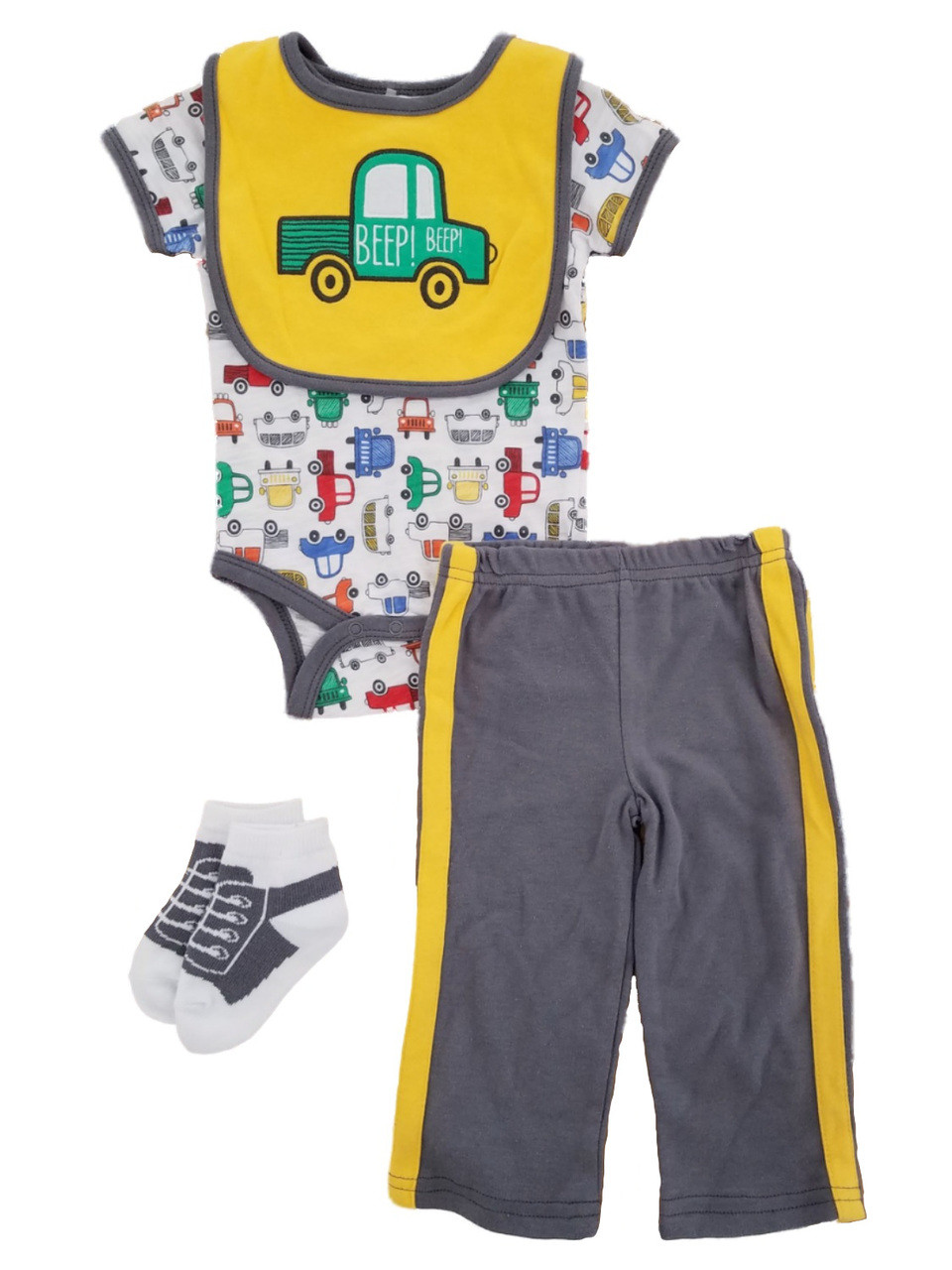 Beep! Beep! This adorable vehicle themed 4-piece layette set is sure to be a favorite! Includes a bodysuit, pants, bib and socks.