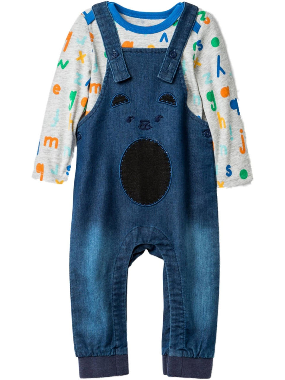 - Infant Boys Blue Gray Alphabet Bodysuit & Denim Critter Overalls Outfit