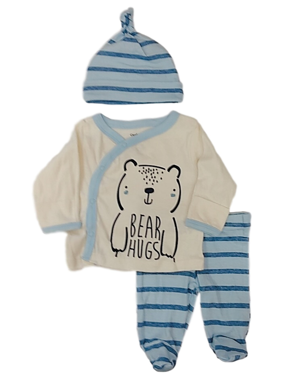 Your little one will look great in this adorable cream & blue 3 piece "Bear Hugs" long sleeve, pants & beanie set.