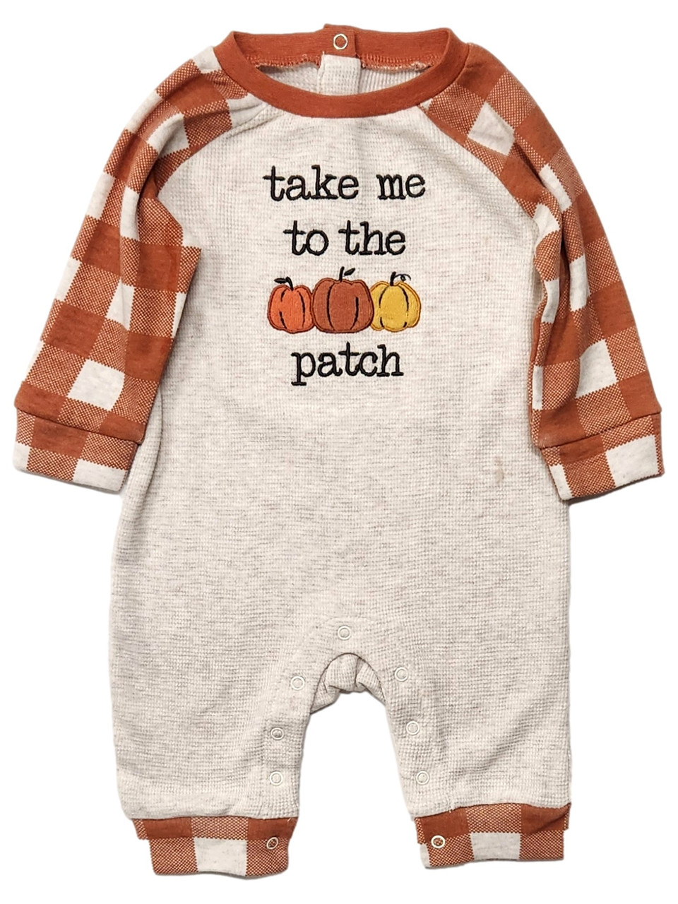 Your little one will be ready for Fall in this fun earth toned "Take Me To The Patch" themed snap bottom baby outfit!