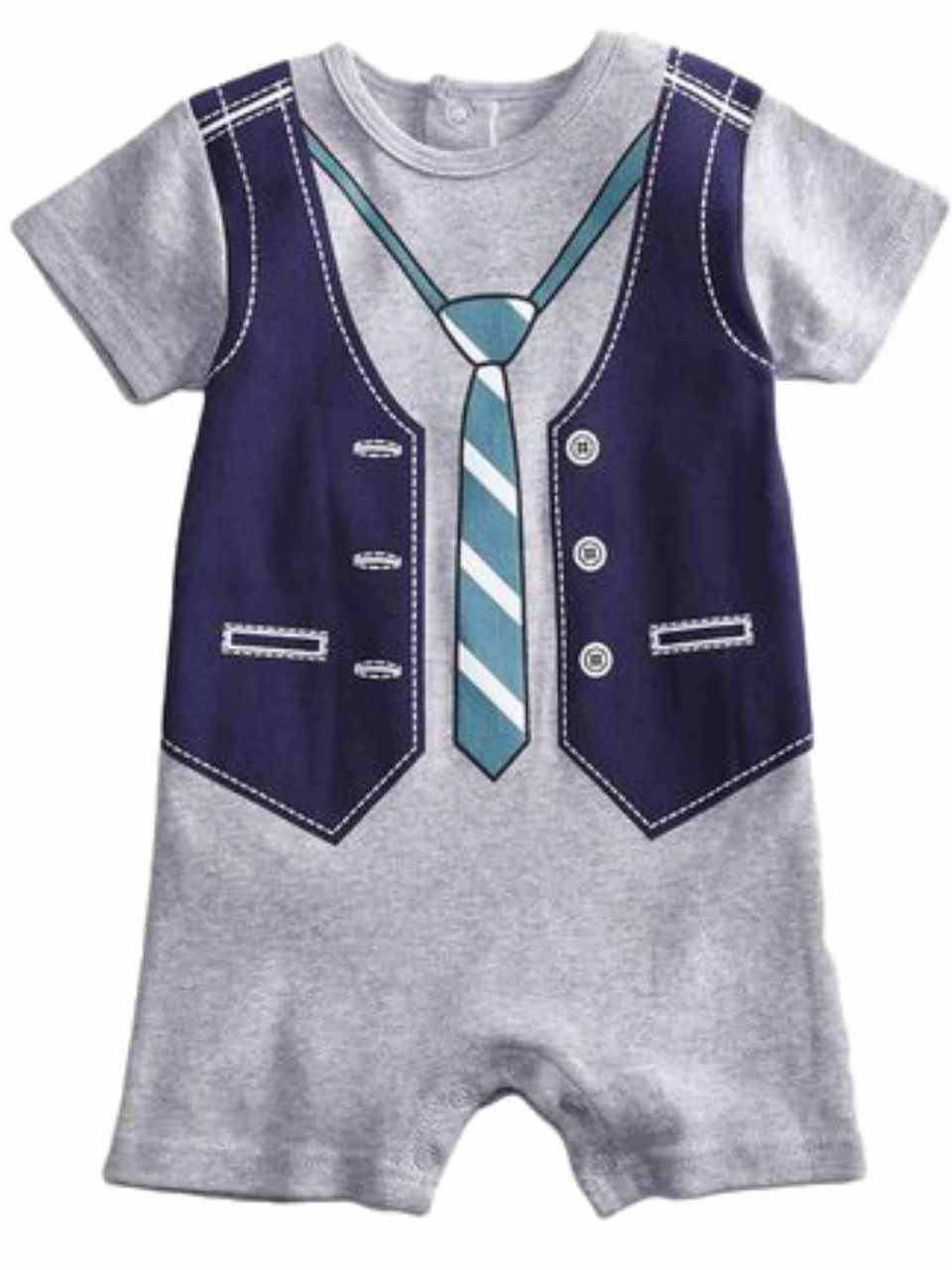 This baby romper has snap bottom and back closures for easy dress up. On the front is a design of a vest and tie.