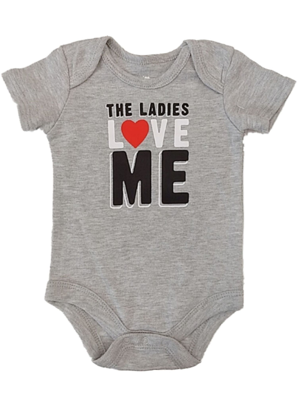 This adorable baby boy's gray "The Ladies Love Me" heart Valentine's day bodysuit is sure to be a favorite!