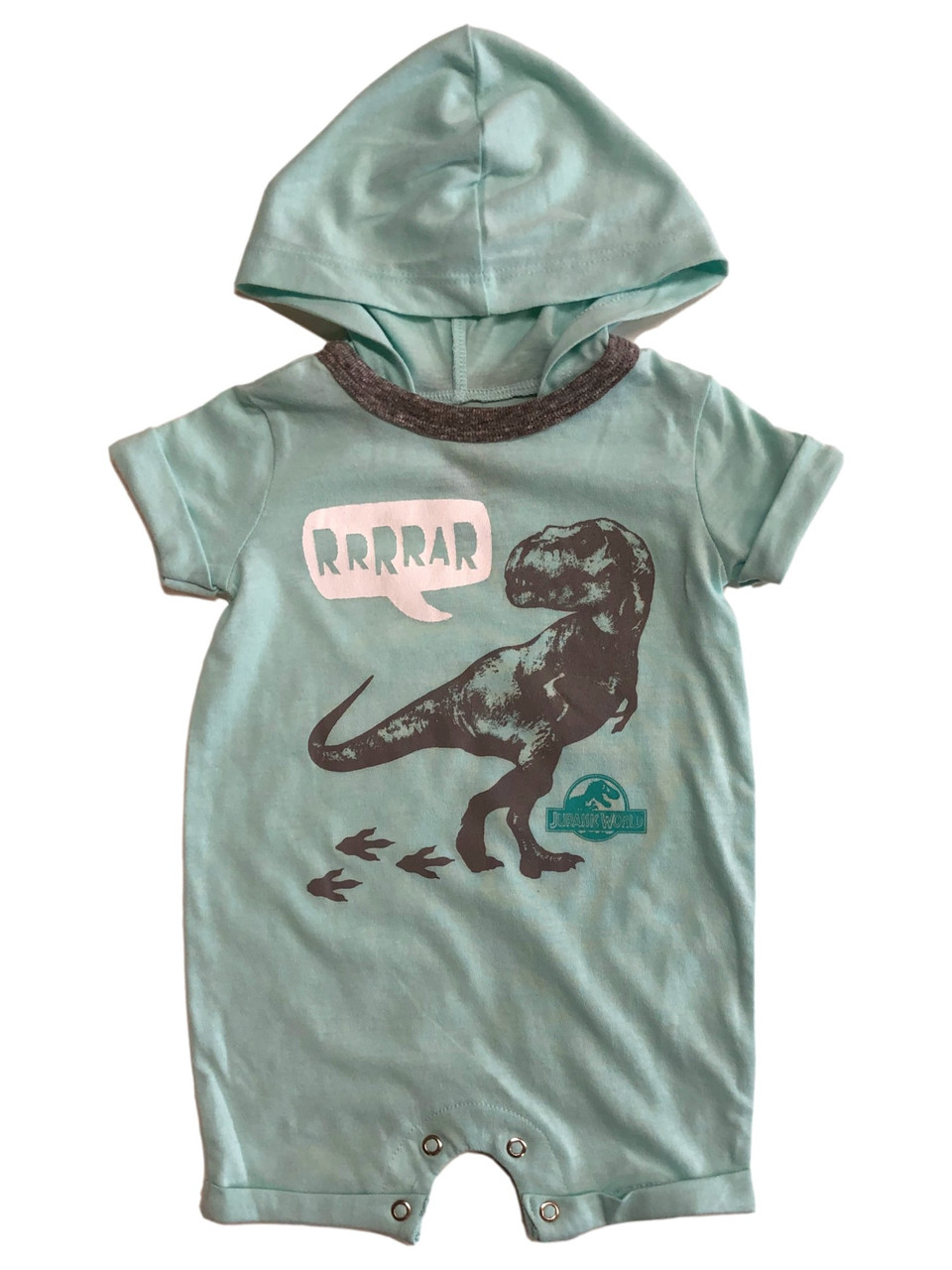 Your little one will look adorable in this fun minty blue "Jurassic World" dinosaur themed snap bottom hooded romper baby outfit!