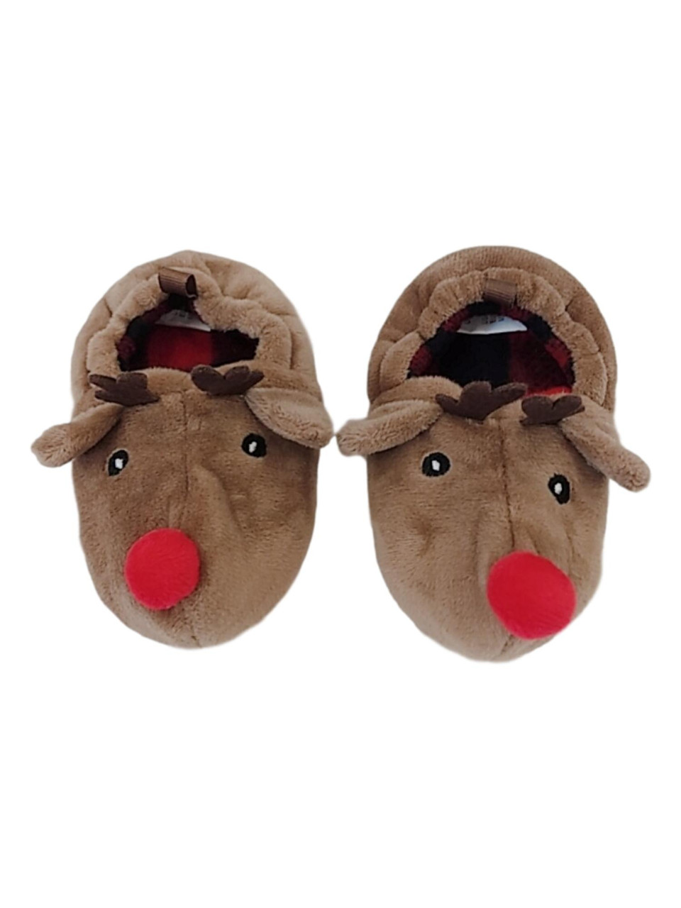 Your little one will love wearing these fun plush brown reindeer themed slippers!