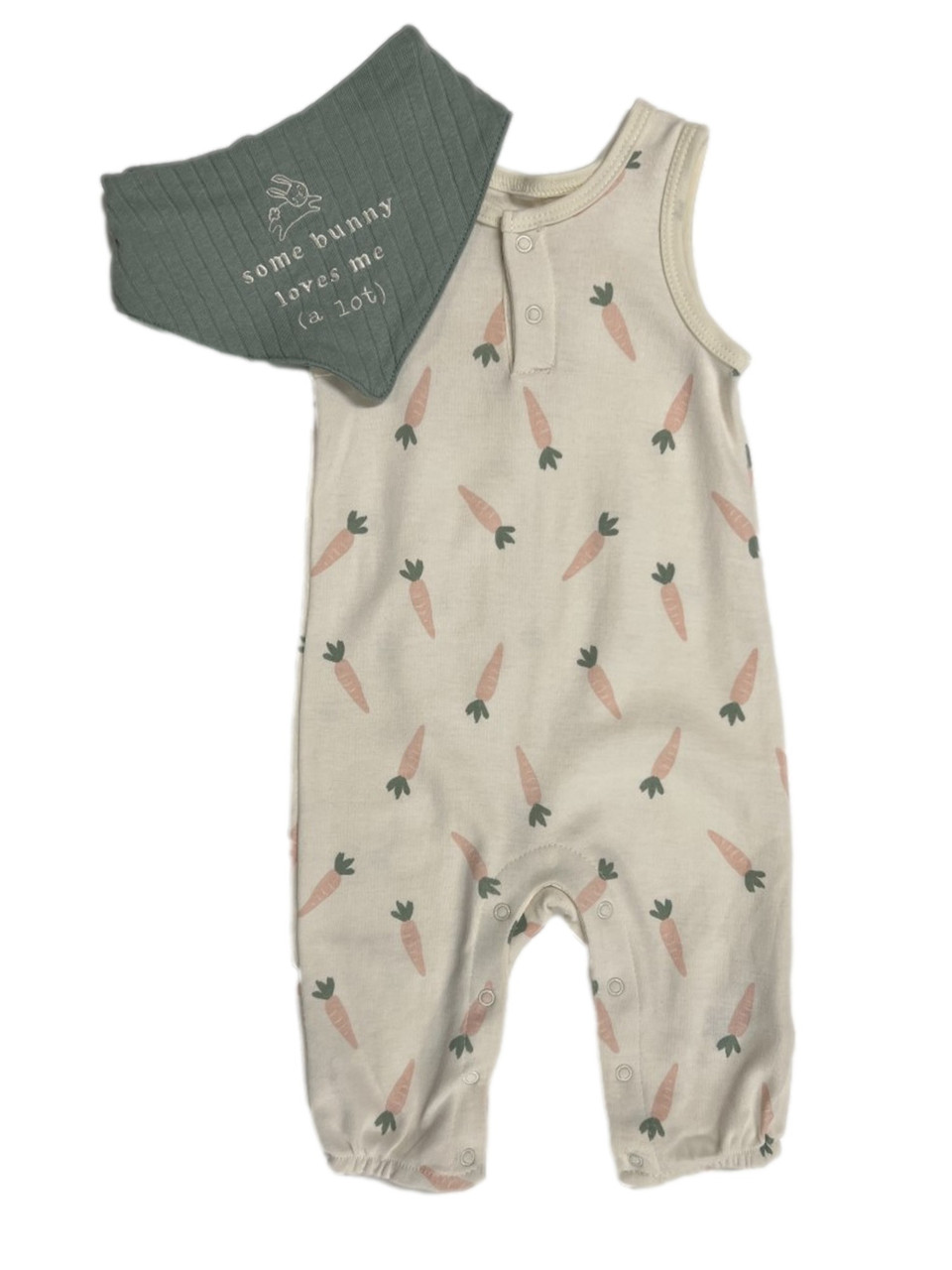 Your little one will look adorable for Easter in this carrot romper with a matching "Some bunny loves me (a lot)" bib set!
