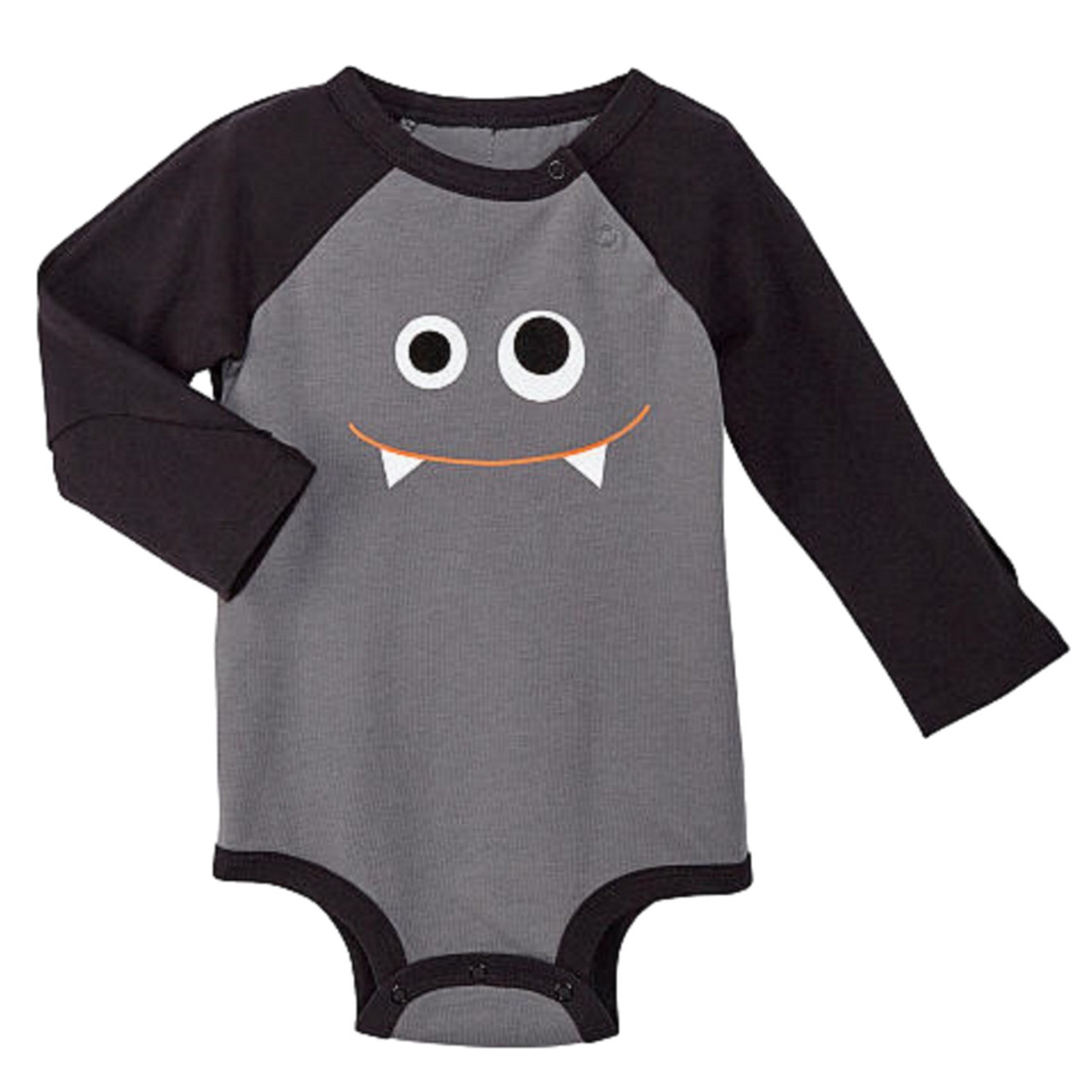 This spooky baby bodysuit has a vampire face on front with attached bat wings on back. Perfect for Halloween!