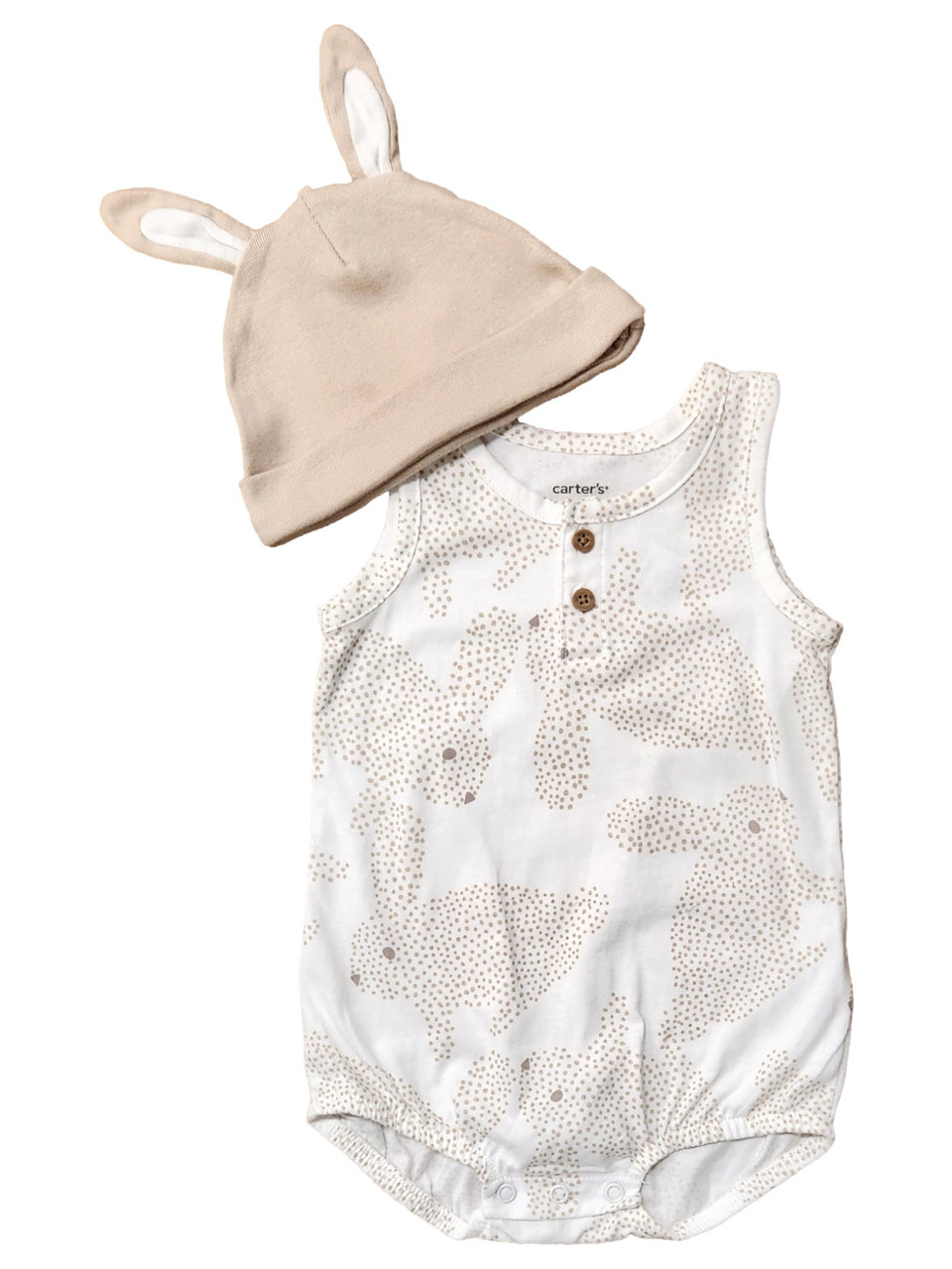 - Infant Boys White With Tan Bunnies Easter Romper With Matching Hat