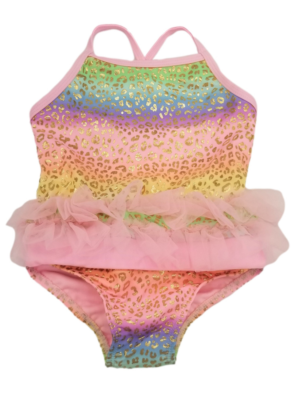 - Infant Girls 1pc Pink & Gold Leopard Print Tulle Skirt Swimsuit UPF 50+
