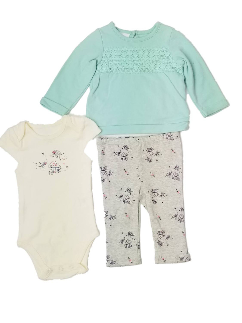 This adorable 3 piece girl's outfit includes a mint long sleeve shirt, and a cute body suite and leggings with mushrooms and fairies.