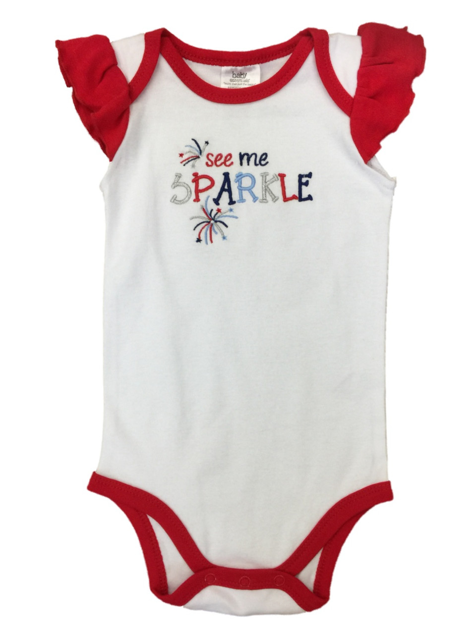 This darling white & red "See me sparkle" patriotic bodysuit is perfect for the 4th of July of everyday use!