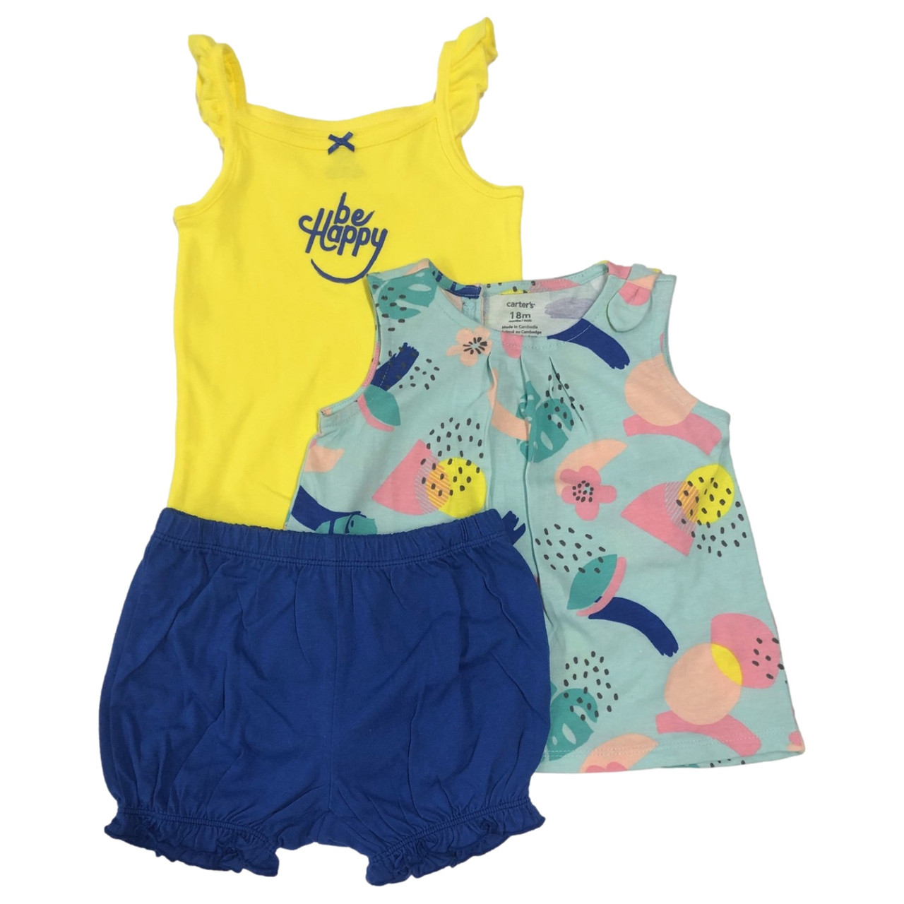 This adorable baby outfit includes a blue floral shirt, blue diaper cover, & yellow "Be happy" bodysuit.