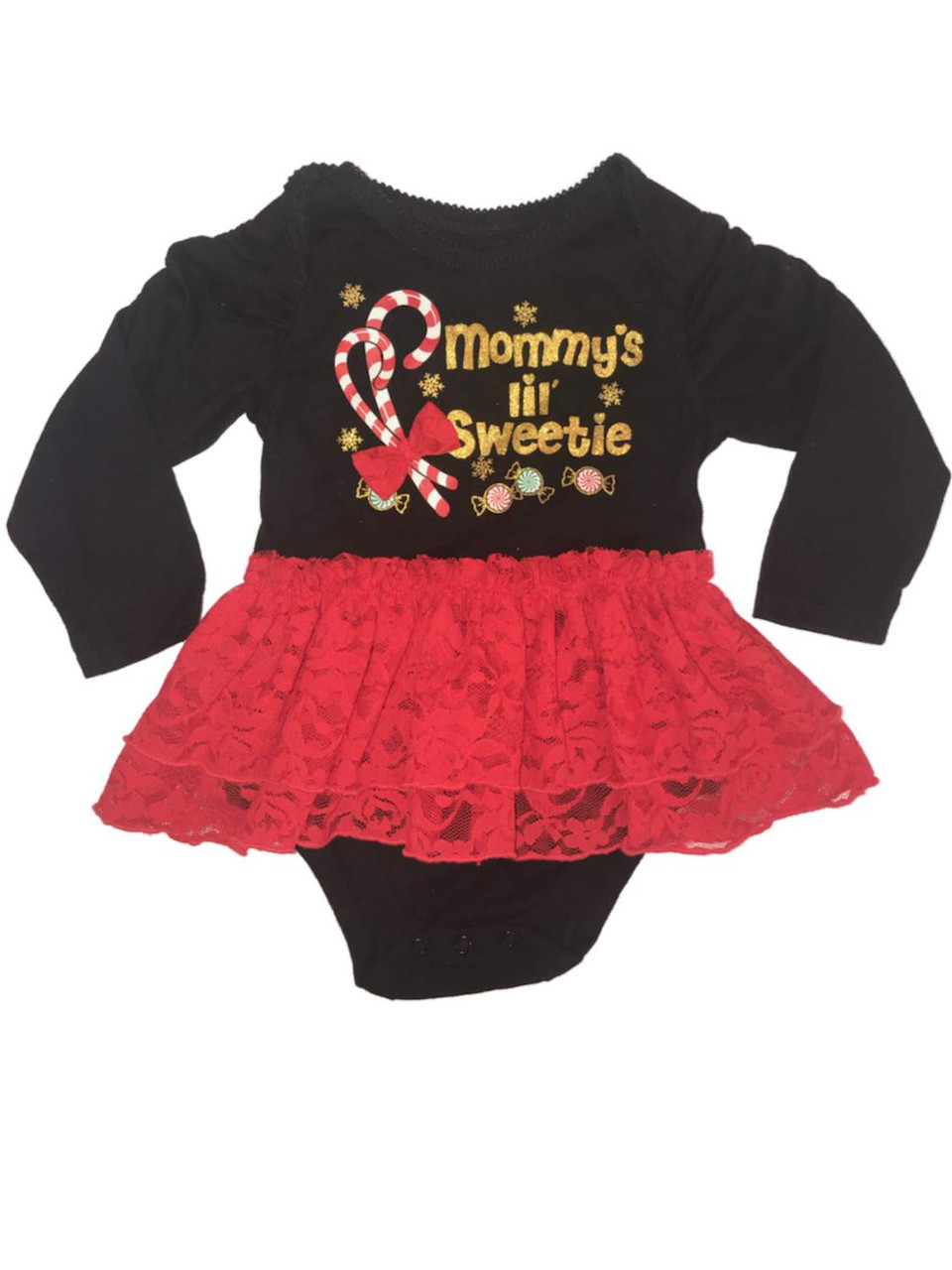 This darling red holiday dress has a long sleeved black onesie base with bow that says "Mommy's lil' sweetie" and an attached red lace skirt.