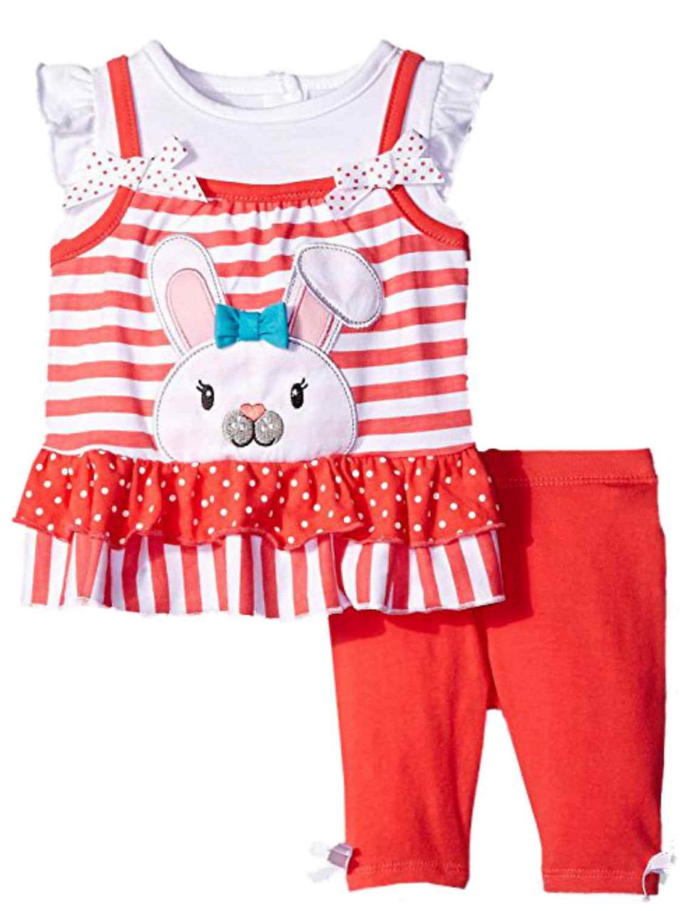 This adorable baby girl's outfit includes a ruffled bunny rabbit shirt & stretch fit leggings.