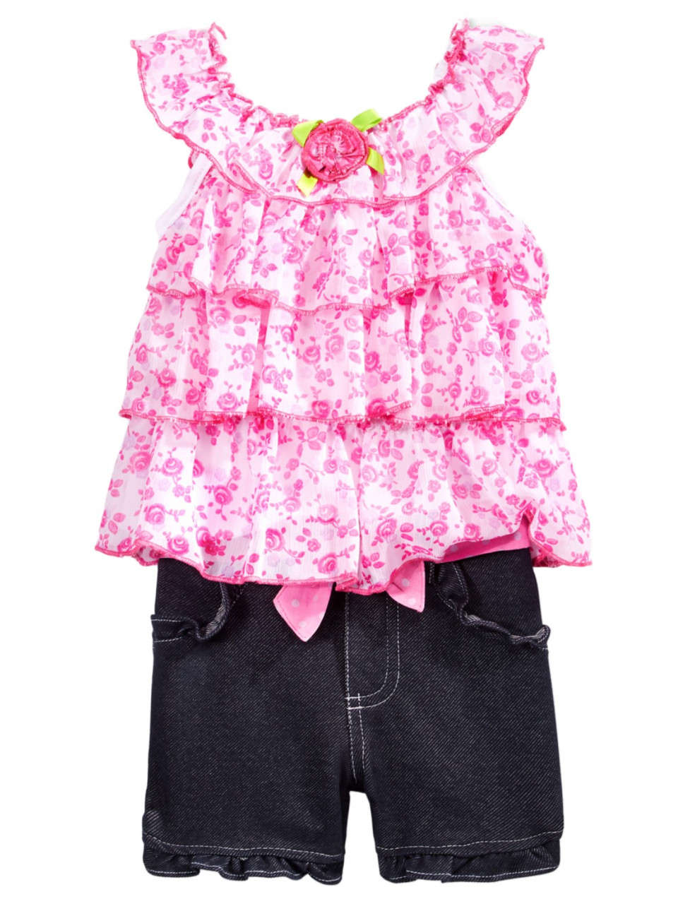 - Infant Girls Pink Floral Baby Outfit Ruffled Chiffon Shirt & Denim Shorts Set