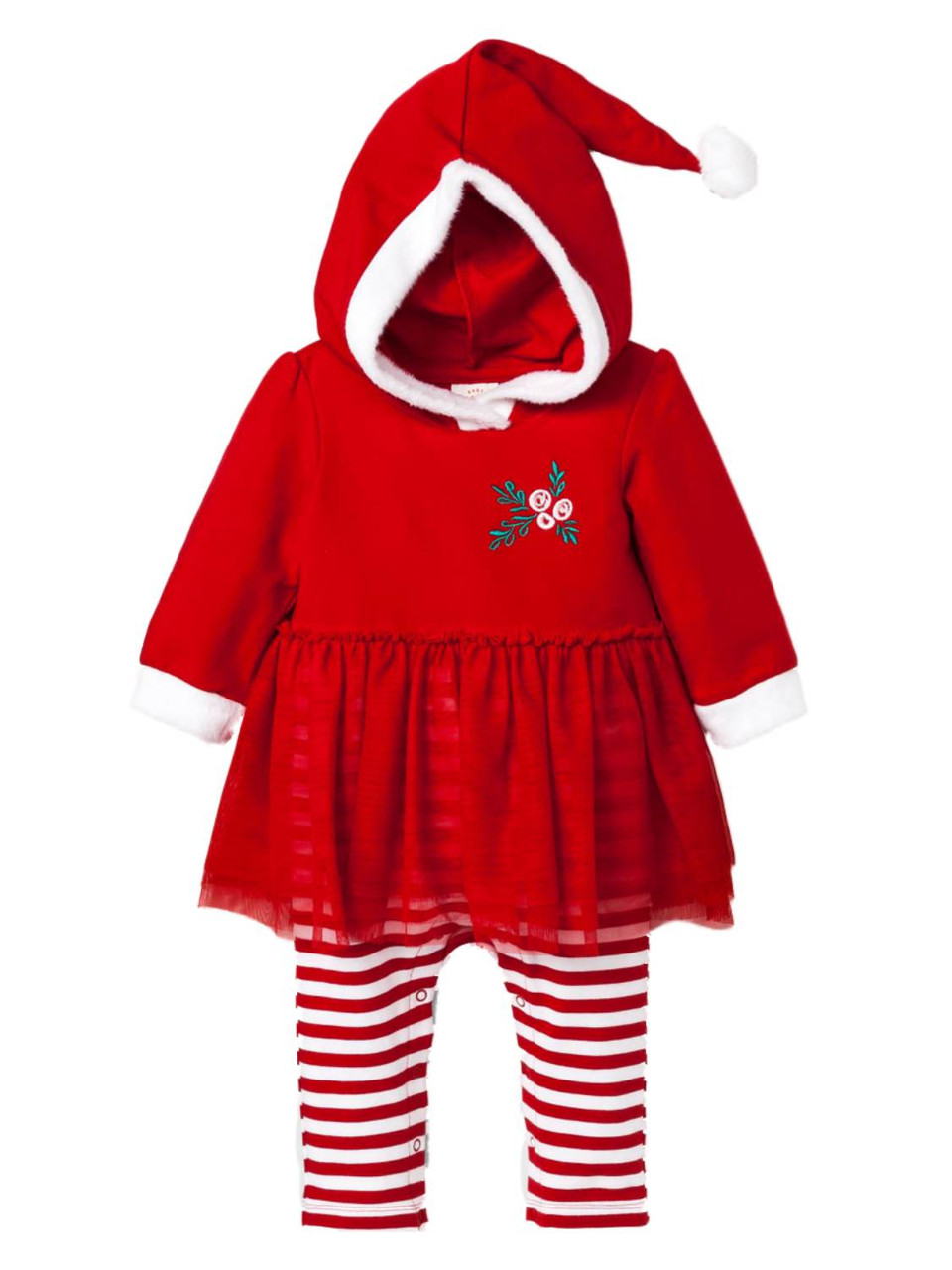 This adorable red & white 1 piece baby girls Mrs. Santa outfit is sure to be a holiday favorite!