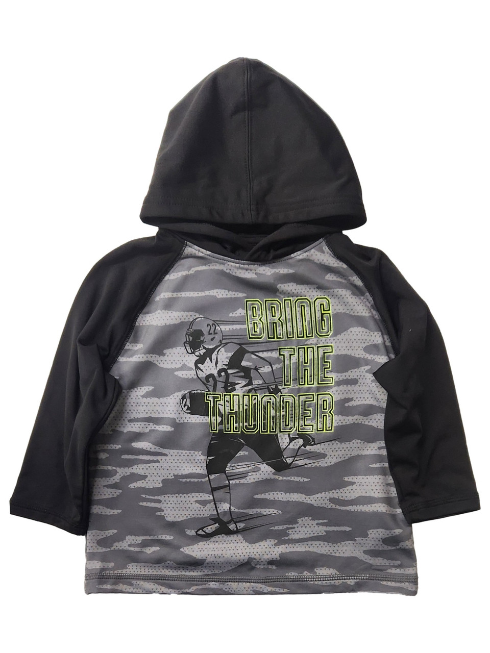 This fun gray camo bring the thunder hooded athletic long sleeve football shirt is sure to be a favorite!