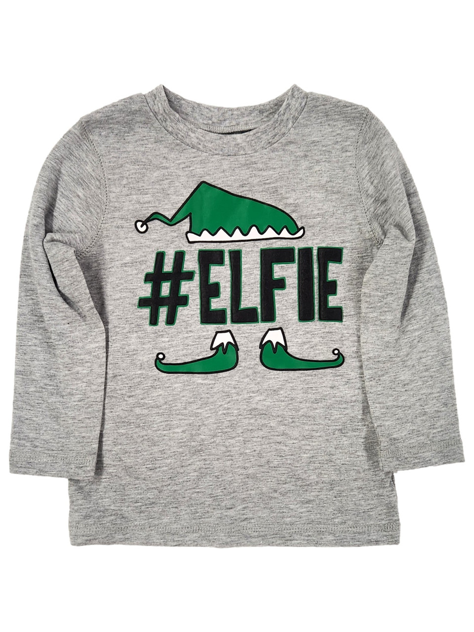 Your little one will look adorable in this fun long sleeved gray #Elfie holiday Christmas t-shirt.