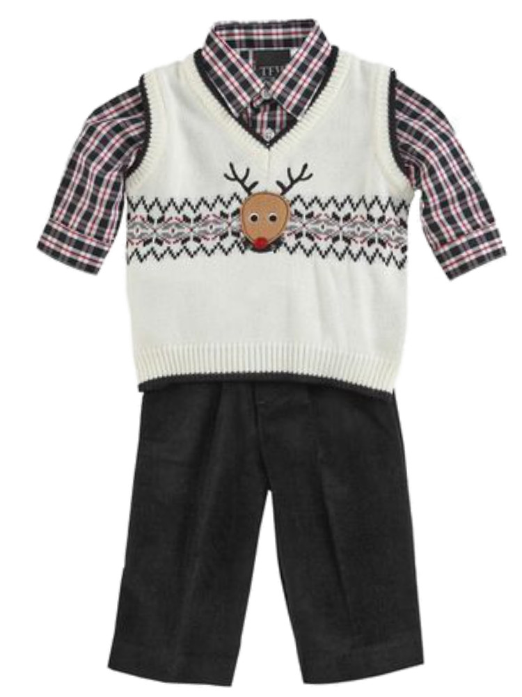 This handsome 3-piece clothing set includes a white knit sweater vest with reindeer design, a black/white/red plaid button-front shirt and black corduroy pants with an elastic waistband. It is perfect for the holidays, picture day and family events!