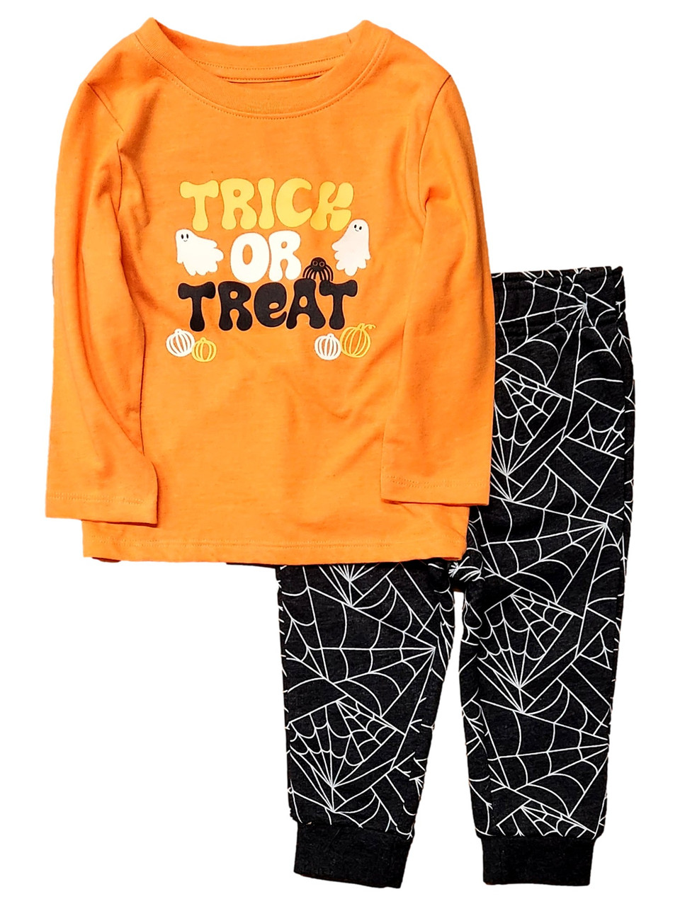 This adorable boys 2 piece orange and gray "Trick Or Treat" long sleeve shirt & spider web pant set is sure to be a favorite for Halloween!