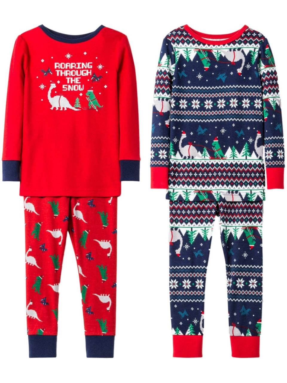 This adorable 4 piece red & blue dinosaur "Roaring Through The Snow" Christmas pajama set is sure to be a favorite for the holidays!