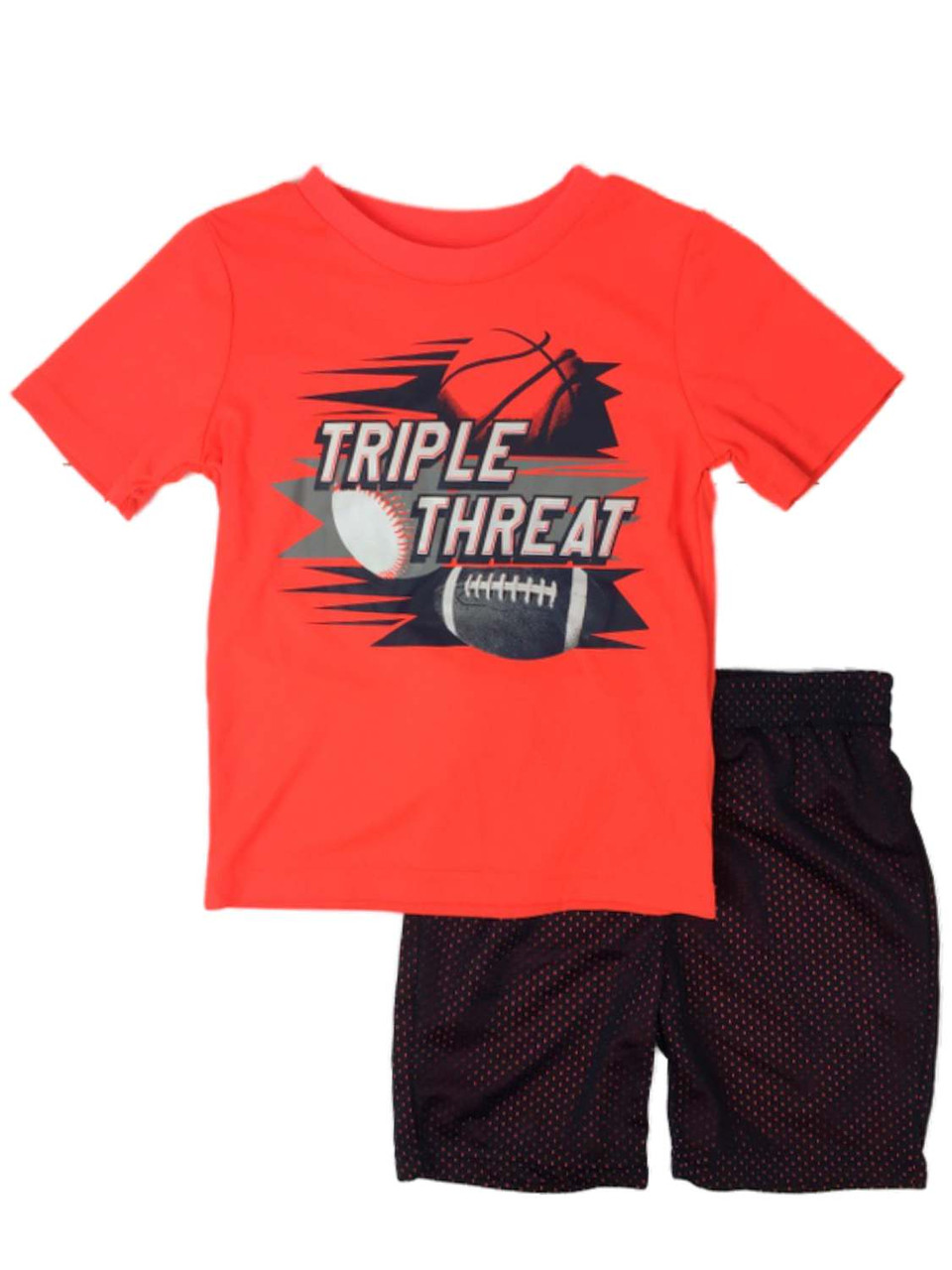 This fun infant & toddler boy's athletic outfit features an orange "Triple threat" sports themed t-shirt & black baller shorts.