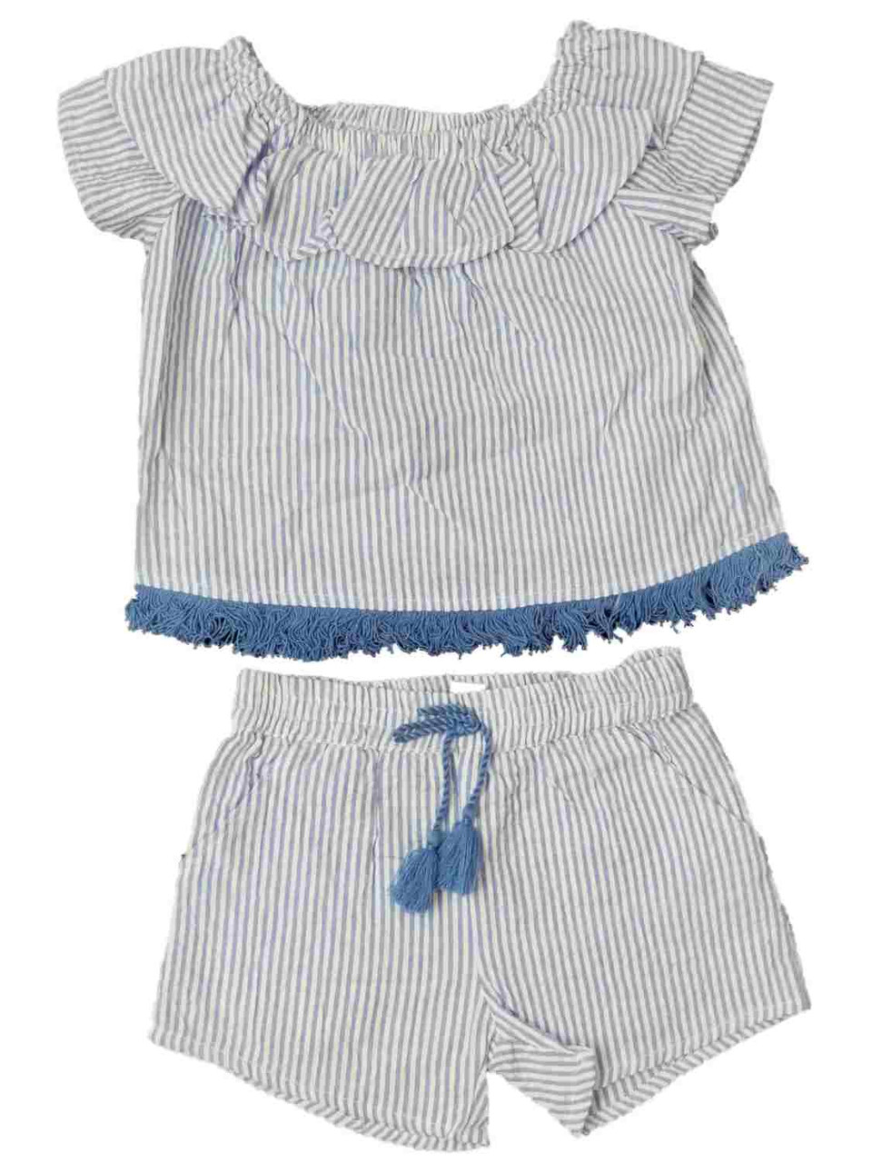 This adorable 2 piece baby girl's outfit includes a blue and white fringe shirt with matching shorts.