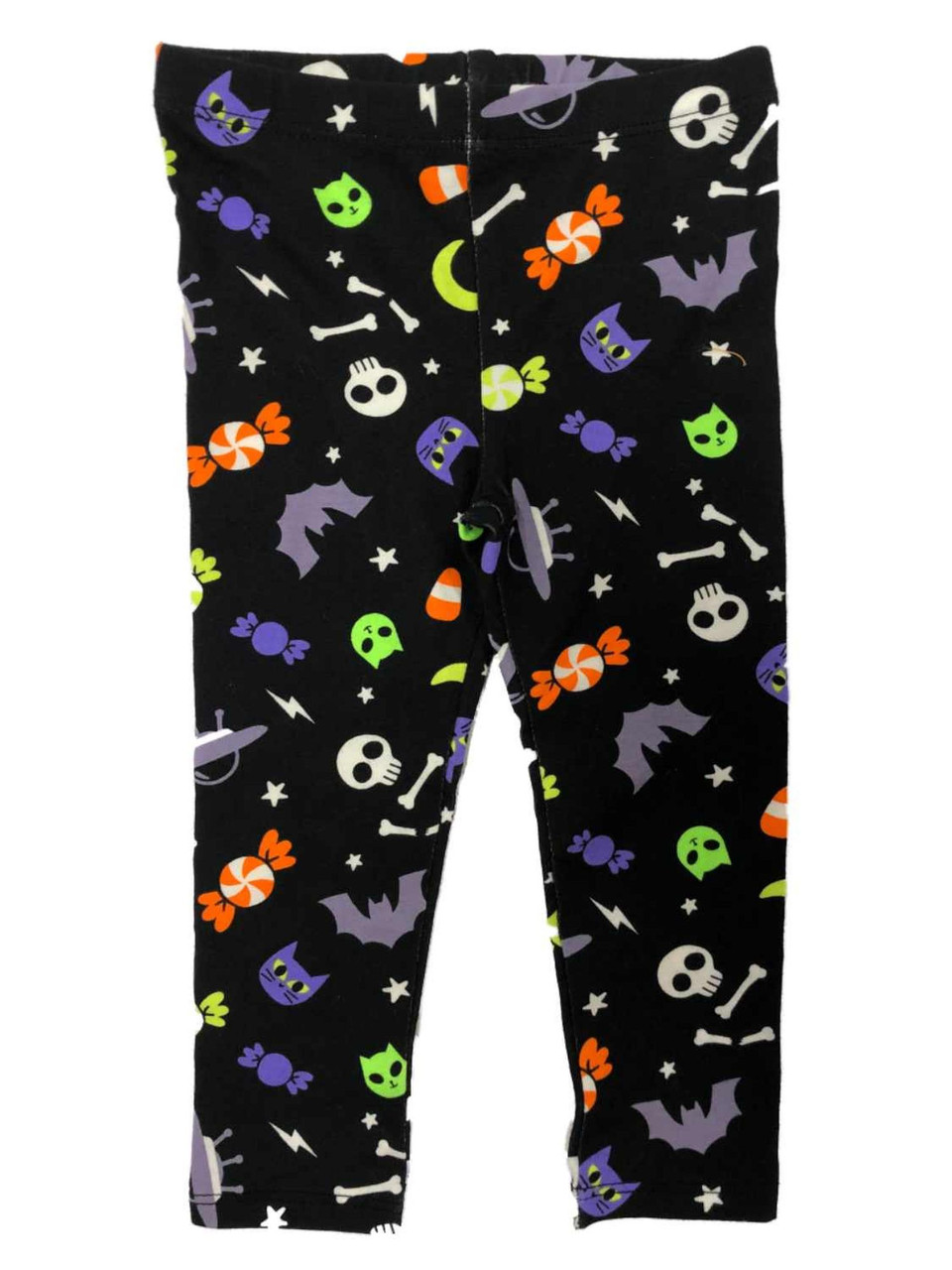 Your little one will love wearing these fun black cat, alien, candy, & bat themed Halloween leggings!