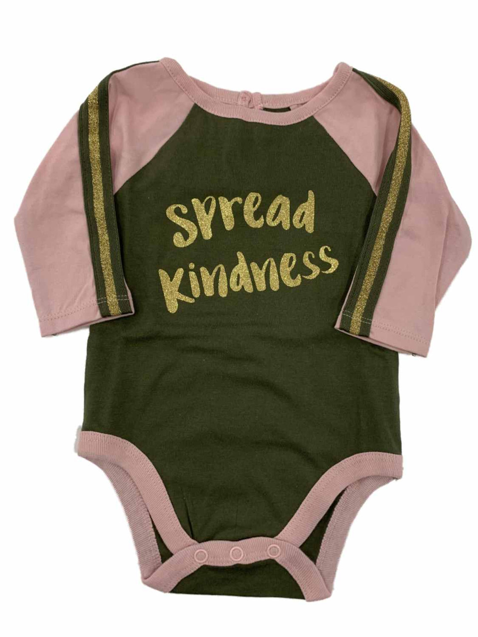 Your little can make a sweet statement " Spread Kindness" in this stylish olive green and pink bodysuit with gold lettering!
