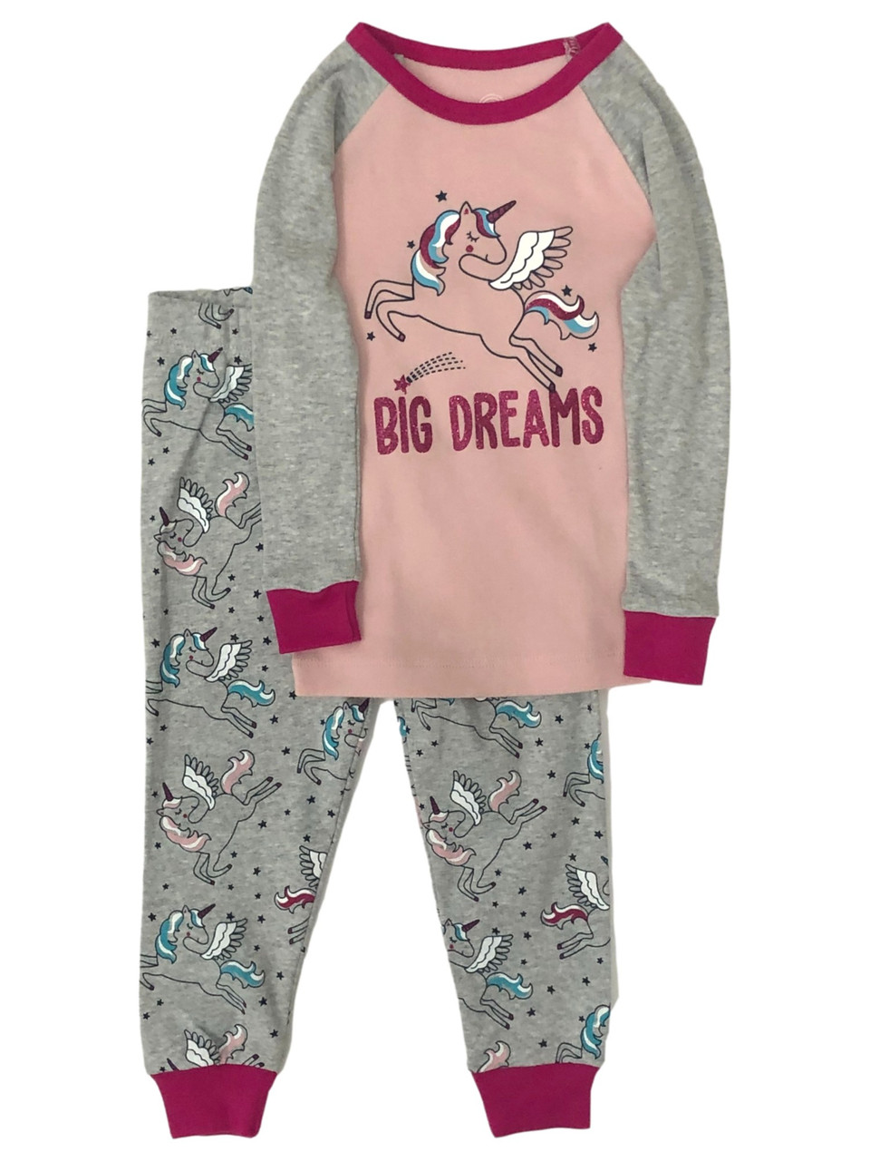 Your little one will love wearing this fun long sleeved pink & gray cotton "Big dreams" Pegasus themed pajama set!