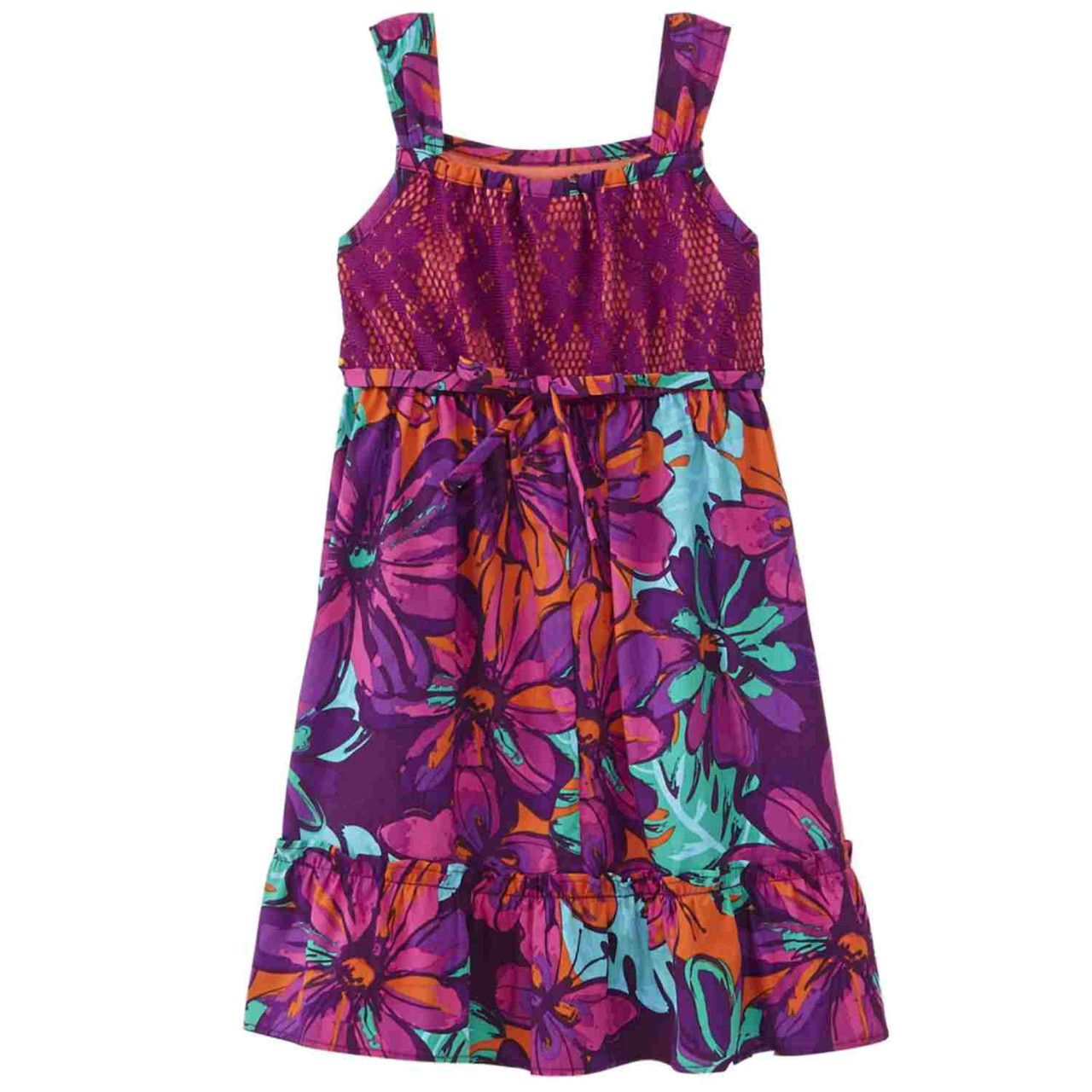 This pretty purple & magenta daisy ruffled sundress is sure to be a favorite!