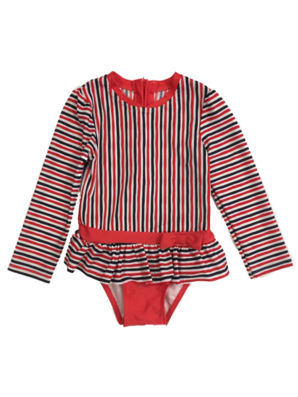 - Infant & Toddler Girls Red & Blue Striped Long Sleeve Rash Guard Swimsuit