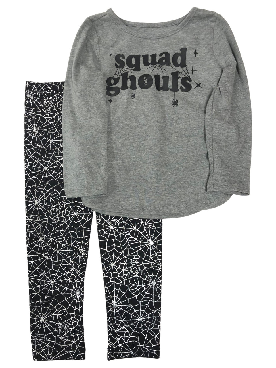 This darling baby girls Halloween outfit includes a long sleeved gray "Squad ghouls" t-shirt and stretch fit black & silver spiderweb print leggings.