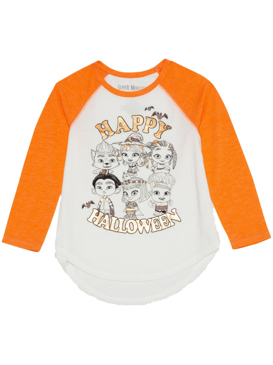 This cute girls white & orange Super Monsters "Happy Halloween" baseball T-shirt has the whole crew Zoe, Cleo, Katya, Lobo, Frankie & Drac it's sure to be a favorite for your little one this season!