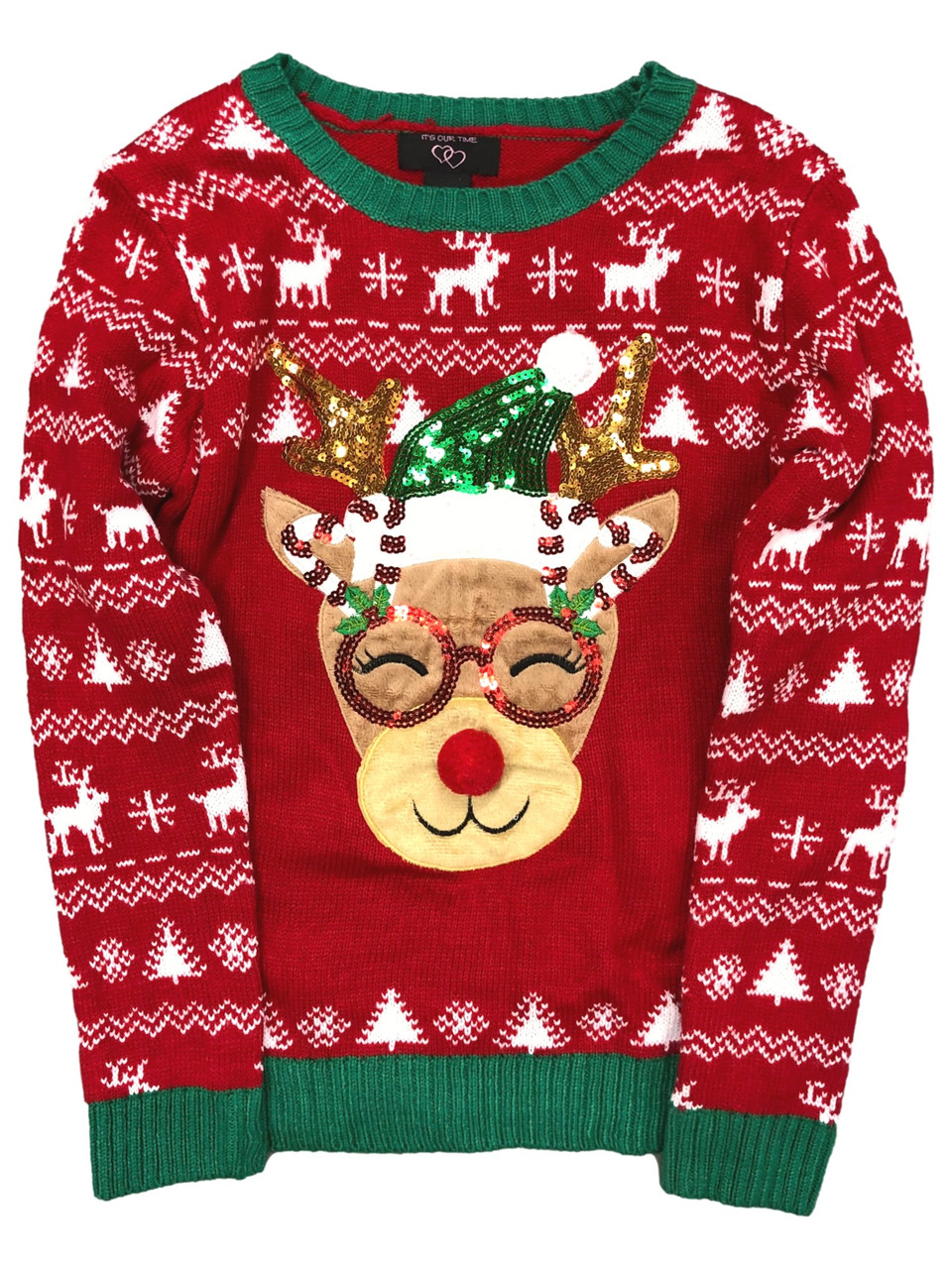 - It's Our Time Girls Red Sequin Reindeer Elf Holiday Christmas Sweater