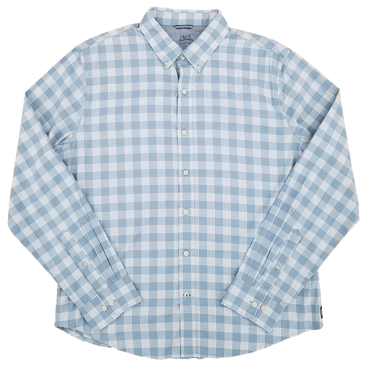 - IZOD Mens Blue & White Check Long Sleeve Slim Fit Untucked Button-Down Shirt