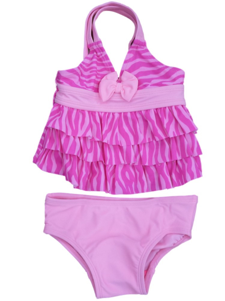 This darling pink tankini swimsuit with zebra print has tiered ruffles, trim with decorative bow at empire waist, spaghetti straps that crisscross in the back, and a surplice neckline top. Matching bottoms have solid trim. t is sure to be a summertime favorite!