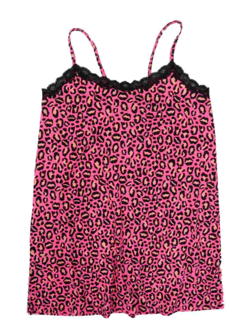 Pretty pink and black leopard print chemise with adjustable spaghetti straps and black lace trim