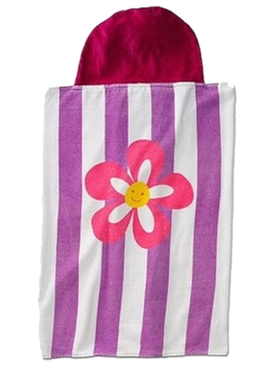 This darling Jumping Beans hooded bath towel has a great look. It features a pretty pink flower on a purple and white striped background!