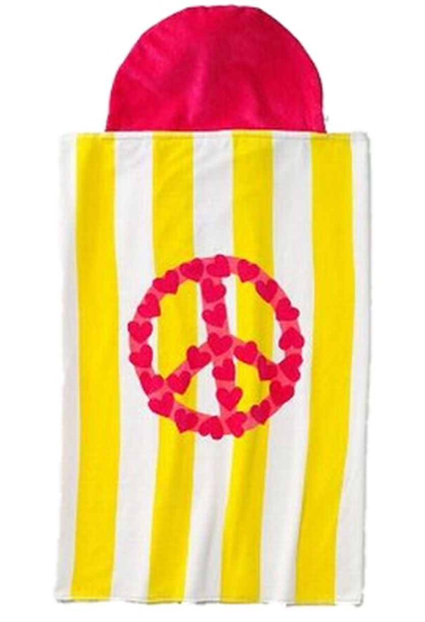 This darling Jumping Beans hooded bath towel has a great look. It features a peace sign made from hearts on a yellow and white striped background