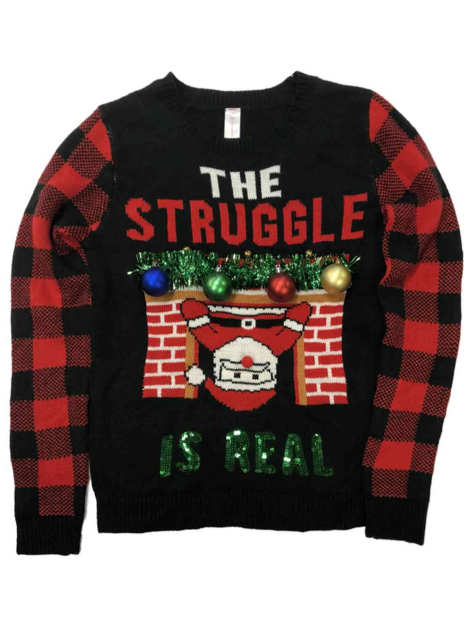 You will get lots of attention in this fun black & red tinsel Christmas tree ornament "The struggle is real" Santa Claus holiday sweater!