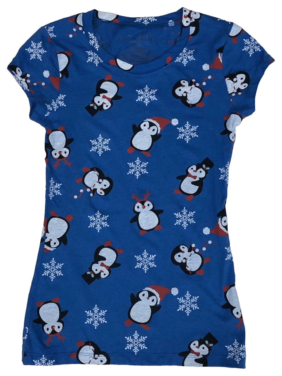 - Junior Womens Blue Penguin Santa Christmas Holiday T-Shirt Tee Shirt