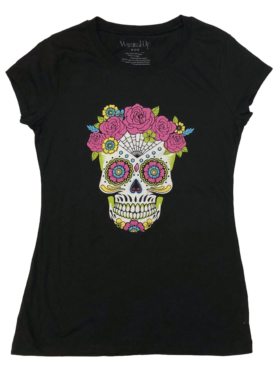 - Junior Womens Colorful Black Floral Sugar Skull T-Shirt Tee Shirt